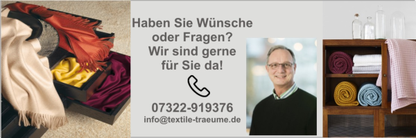 Willkommen im Webshop von TEXTILE TRÄUME ! Hier finden Sie ausschließlich hochwertige Heimtextilien rund um das Thema Schlafen und Wohnen! Luxuriöse Bettwäsche bekannter Marken, gefertigt aus den besten Materialien reine Seide, Satin, feiner Jersey, hochwertige Daunendecken, Zudecken, Kissen und bequeme Matratzentopper. Alle Übergrößen und Sondermaße sind möglich ! Ob Handtuch, Badetuch, Badezimmerteppich, auch hier haben wir die schönsten Qualitäten für Sie zusammengestellt. Weiterhin finden Sie schöne Hausmäntel und Bademäntel. In der Tischwäschekollektion erwartet Sie erlesenes Leinen von Leitner oder schöne Jacquard Tischwäsche von Garnier Thiebaut aus Frankreich. Eine spezielle Kollektion für Kinder, eine sehr edle Tag-Nachtwäsche Kollektion für Damen und Herren und ein Angebot an Plaids, Decken und modischen Accessoires, Capes, Schal, Tücher, Mützen aus Cashmere, Wolle und Seide runden das Angebot ab. Wir führen Kollektionen namhafte Markenhersteller z.B. Christian Fischbacher, Schlossberg, Zimmer&Rohde, Cellini Design, Sichou Seidenmanufaktur, Leitner, Garnier Thiebaut, Novila, Graser, Curt Bauer, Momm, Feiler, Rhomtuft, Egeria, Eagle Products, Dauny, Billerbeck. Entdecken Sie die neuen Kollektionen.