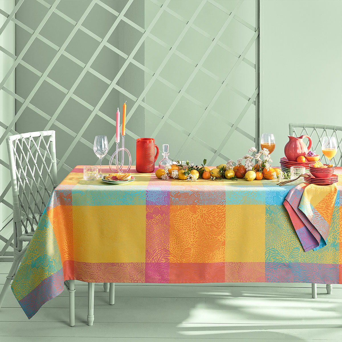 Diese Tischdecke aus 100% Baumwolle hochwertiger Damast mit gewebtem sommerlichen Farben, ist pflegeleicht und abwaschbar. Durch die Oberflächenbeschichtung aus Acryl zum Schutz gegen Flecken ist diese schöne Decke unempfindlich und abwaschbar.